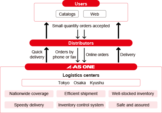Our quick delivery system allows us to provide "what you need when you need it." We can complete shipment in as little as twenty minutes after receiving shipment instructions thanks to our core system. Our advanced inventory control system allows us to achieve 95% same-day shipment by leading the industry convincingly in the number of available items and the inventory level. In addition, AS ONE sells a wide range of products with free shipping, like a retailer, even for 1 product. There is no need for dealers to hold inventory. The customer can order from AS ONE only as needed, thereby eliminating any need to manage troublesome inventory.